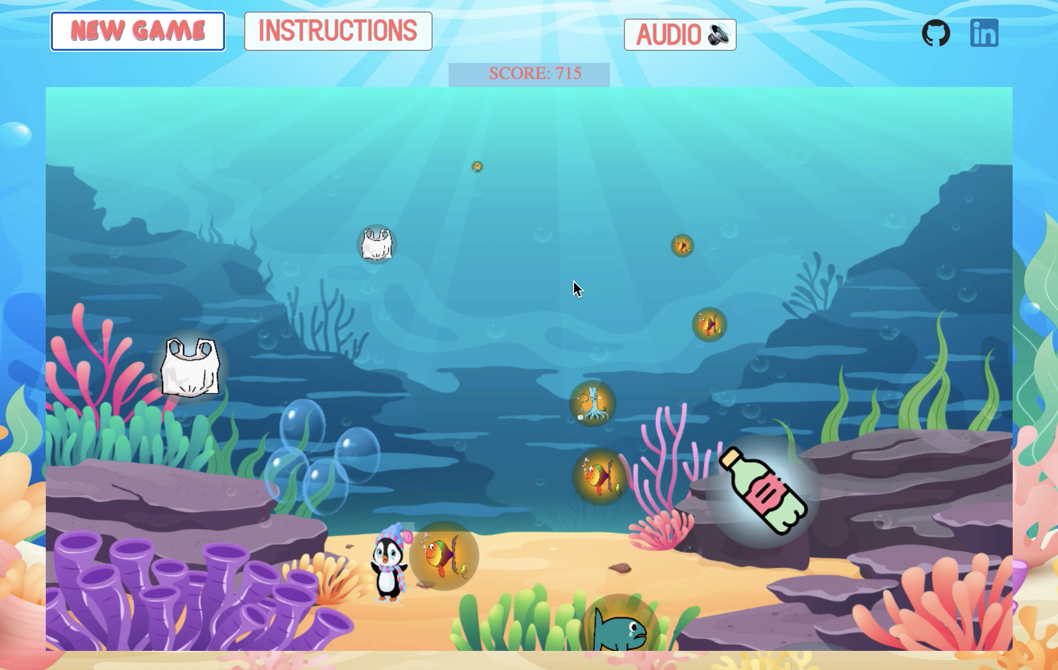 Save the penguin by grabbing food and avoiding trash in the ocean!